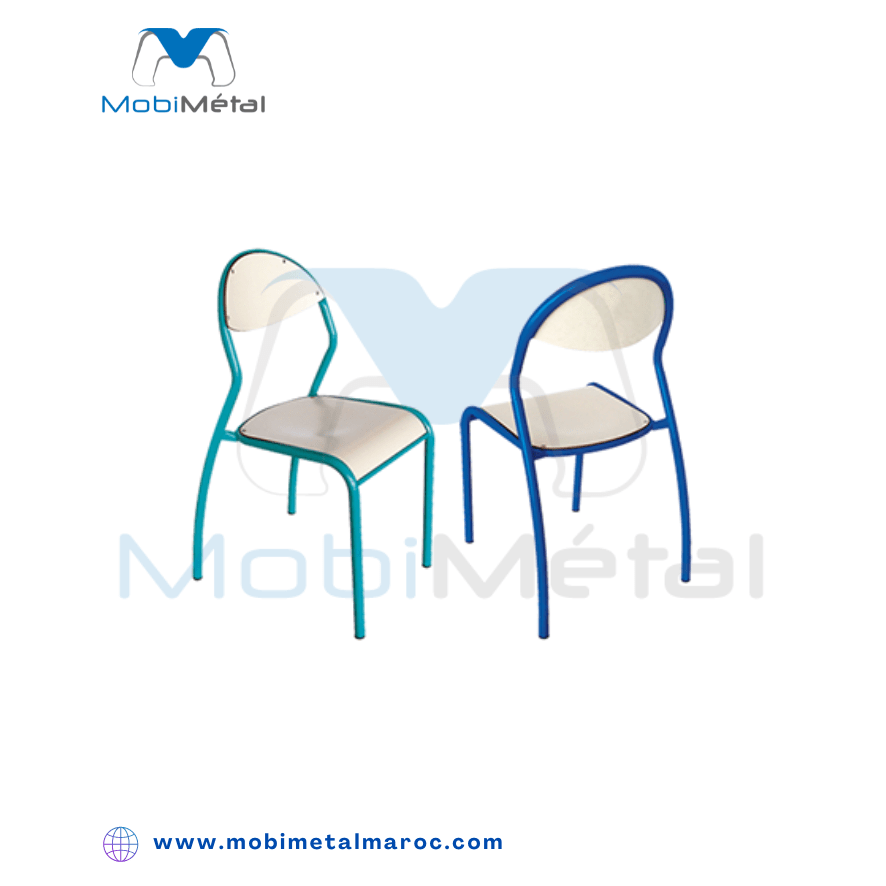 Chaise Ilias à structure renforcée Structure métallique en tube cylindrique 25 mm de diamètre, épaisseur 1,5, revêtu Epoxy, couleurs au choix suivant nuancier. Siège et dossier encastrés, en contreplaqué, vernis ou lamifiés.